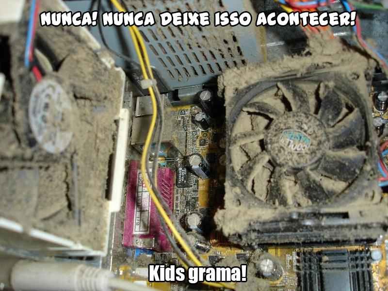 muita poeira no seu interior e não utilizam ventiladores.Lembre-se, NÃO COMA NO COMPUTADOR, pode derramar desde comida, farelo ou ate líquidos dos mais diversos tipos em seus periféricos ou ate mesmo (duvido muito você conseguir, mas não subestimo) na CPU. As vezes é necessário limpar a tela do monitor com um pano macio e úmido (quando a maquina estiver desligada) regularmente virar seu teclado e dar umas balançadas para cair a poeira. ̶e̶u̶ ̶t̶o̶ ̶l̶i̶g̶a̶d̶o̶ ̶q̶u̶e̶ ̶d̶e̶ ̶t̶a̶n̶t̶o̶ ̶f̶a̶r̶e̶l̶o̶ ̶q̶u̶e̶ ̶v̶o̶c̶ê̶ ̶d̶e̶i̶x̶a̶ ̶e̶n̶t̶r̶a̶r̶ ̶n̶o̶ ̶t̶e̶c̶l̶a̶d̶o̶,̶ ̶c̶a̶i̶ ̶u̶m̶ ̶p̶ã̶o̶ ̶i̶n̶t̶e̶i̶r̶o̶ ̶d̶e̶ ̶d̶e̶n̶t̶r̶o̶ ̶s̶e̶ ̶b̶a̶t̶e̶r̶ ̶